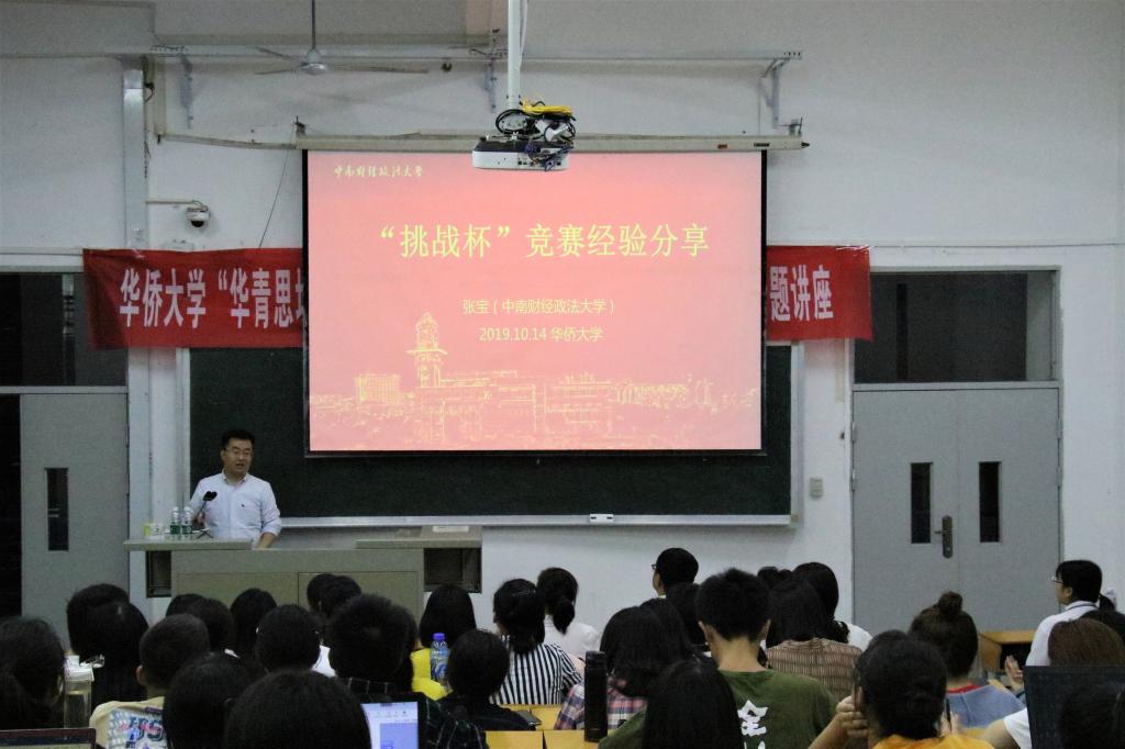 10月14日晚,校团委、法学院联合主办的华侨大学“华青思坛”2019年第三讲暨法学院“创新工坊”挑战杯专题讲座在祖杭楼2-2教室举行,中南财经政法大学法学院经济系主任张宝副教授应邀做题为“‘挑战杯’课外学术科技作品竞赛参赛解读与经验分享”的报告,报告会由法学院团委书记吕煜主持。