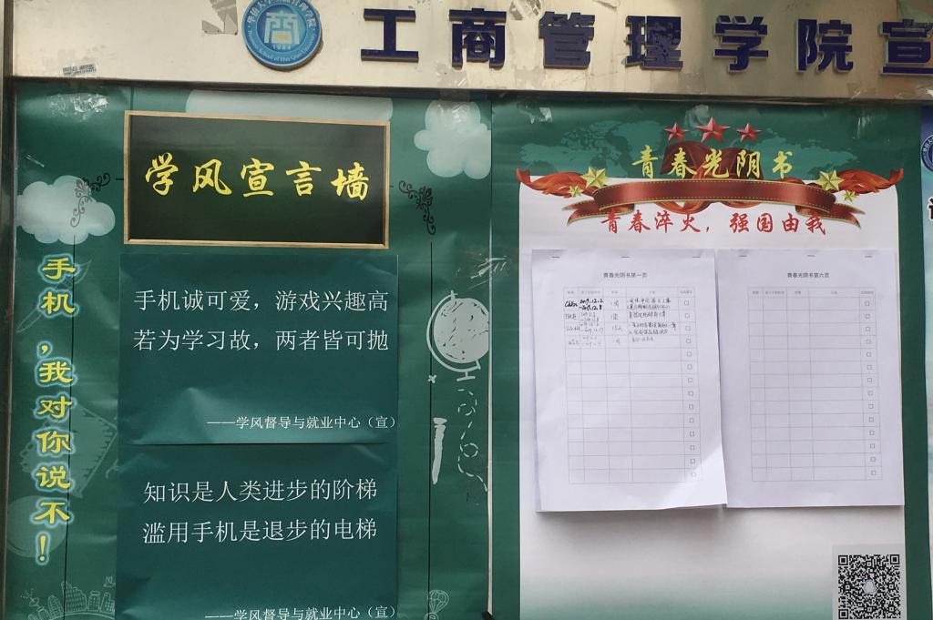 该活动分为线上、线下两种参与方式。线上同学们通过QQ群,分享自己不玩手机的相关计划,相互监督计划完成情况;线下则在经管大楼的工商管理学院宣传栏上设“青春光阴书”版块,同学们在此设立目标,激励自己。此外,宣传栏上设有“学风宣言墙”,海报、推文也进行相应宣传,引导同学自发放下手机。