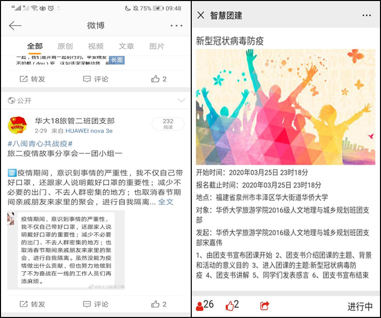 此外,旅游学院各班团支部还积极通过QQ、微信、微博、抖音等新媒体渠道,广泛动员班级同学参与团中央、团省委和学校相关“战‘疫’有我”“众志成城,抗击疫情”等话题讨论,对话题进行转发,积极参与评论、点赞。同时主动进行疫情防控专项知识宣传,纷纷用文字或视频写下自己在抗击疫情期间的心得体会,积极发声传递青春正能量。