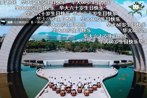 队员们通过弹幕的形式在屏幕上打出“祝福华大60岁生日快乐”、“祝2016级鼓手毕业快乐”等祝福语,通过这个特别的方式在云端为学校建校60周年以及2016级毕业生顺利毕业送上祝福。
