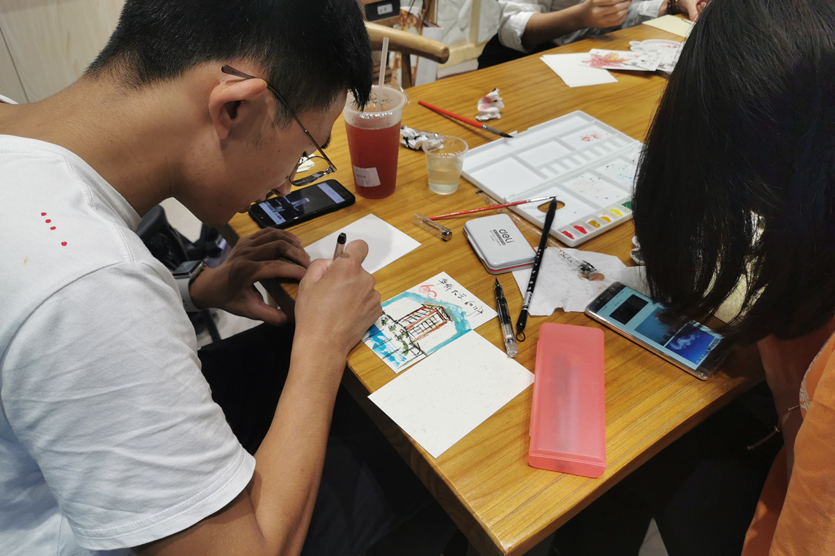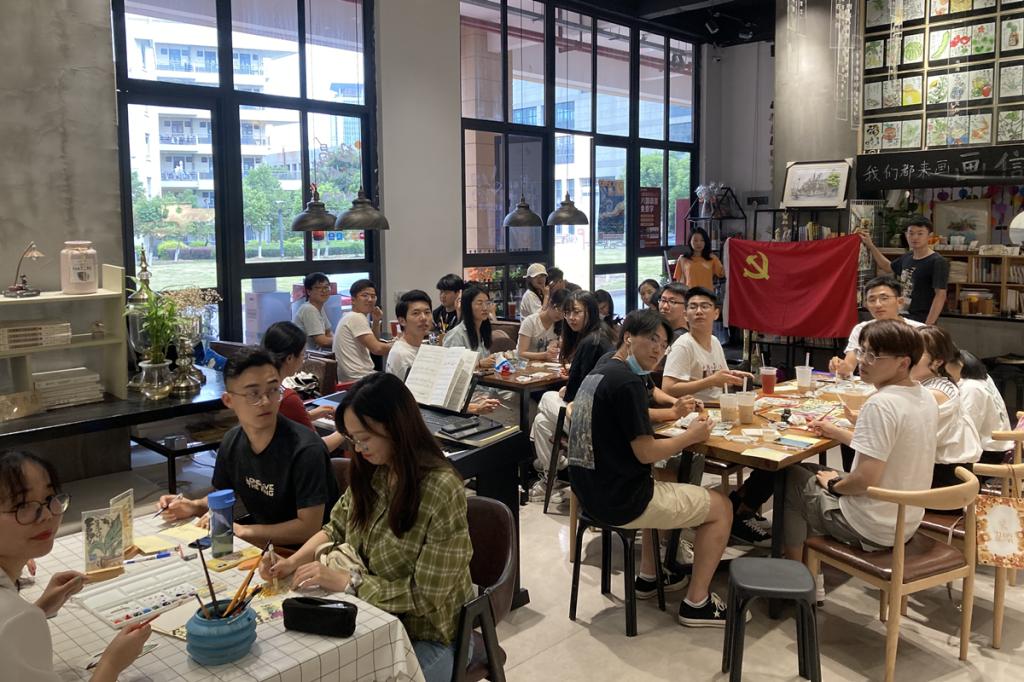 研一、研二的部分党员同志早早来到了活动地点,同时还有入党积极分子也参与了这次活动。参加活动的每个人领几张小卡片,活动要求就是在卡片上用水彩绘画出校园一角,可以是建筑、风景、人物等,完成之后会收集起来进行集中展示。大家一边绘画一边交流,主题党日活动展示不一样的特色。