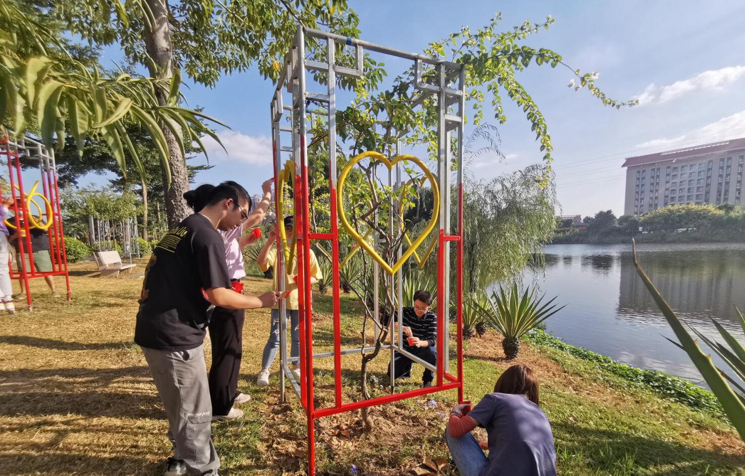 党员们利用周末和周二下午等时间,给前期设计加工好的以“HQU 60♡”为主体的景观钢架刷上油漆、给湖边三角梅景观亭的钢架进行彩绘,方案的设计理念寄托了建筑学子对母校60周年校庆的深深祝福与美好期待,同时也表达了对华侨大学的热爱与赞美。党员们迎着烈日,累计工作了近7个小时,完成所有的刷漆和彩绘干工作。