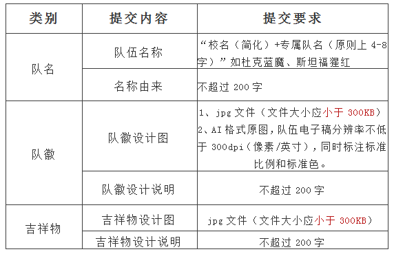 3.队名字数原则上控制在4至8个字,且避免与其他参赛学校和其它短语或广告语相混淆雷同。队名还需附上创意描述(不超过200字)。