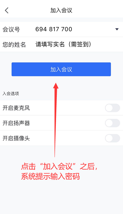 (二)加入会议(点击“加入会议”,输入“会议ID号”及“会议密码”)。
