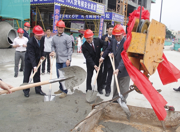 出席封顶仪式嘉宾浇筑水泥为大楼封顶