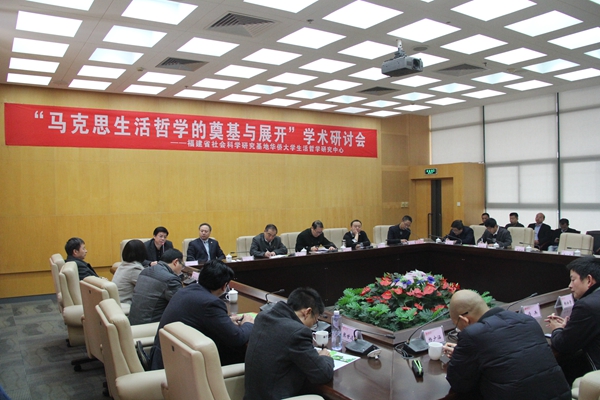 揭牌仪式后,生活哲学研究中心举行了“马克思生活哲学的奠基与展开”学术研讨会。王福民介绍了生活哲学背景及研究前景,中心外聘专家鉴传今作主题发言,福建省社科研究基地2014年重大项目负责人、中心成员王福民、罗建平、常旭旻分别作《马克思主义生活哲学重大理论问题》《生活哲学视域下现代消费社会批判》《西方生活哲学论著选评(古希腊罗马)》主题发言。