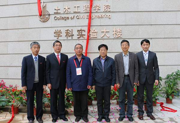 谢礼立(右三)、龚晓南(左三)、关一凡、刘塨、李冀闽、郭子雄为土木学科实验大楼揭幕