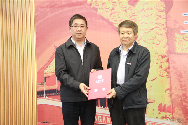 校党委书记关一凡为李强教授颁发华侨大学兼职教授聘书并佩戴校徽