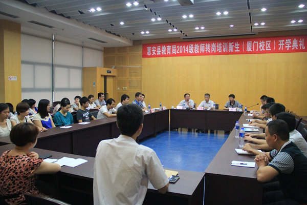 24日上午,惠安县教育局2014级教师转岗培训新生开学典礼在我校厦门校区王源兴国际会议中心203会议室举行。华侨大学副校长刘塨、惠安县教育局局长陈建辉等出席并致辞,26位参加培训的教师参加开学典礼。