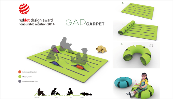 “Gap Carpet——趣味地毯”是一款有趣多变的家居地毯设计,它利用了简单的缝隙自由营造不同的空间,满足不同的使用需求,让家居生活随性自由,充满了趣味互动;也可以顺着缝隙方向卷成圆柱型后360度弯曲固定成可爱的单人沙发。
