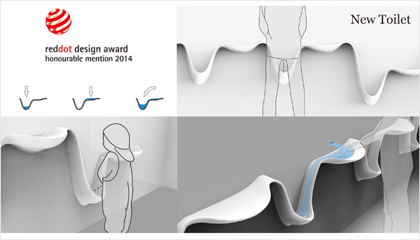 “New Toilet——高山流水”是一款打破传统的公共小便器设计,小便器与洗手台融为一体,让洗手的水流入小便器,简单地形成二次利用,让节水变得优雅、自然。