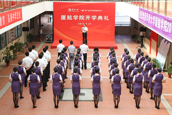 今日上午,厦航学院49名身着制服的新生参加了在厦门校区综合教学楼E区举行的开学典礼。他们是华侨大学与厦门航空公司合作创办的华侨大学厦航学院的首批本科生。