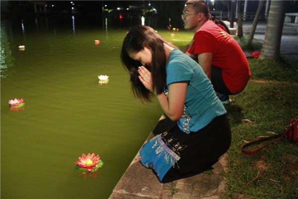 秋中湖畔,一些师生正托着下巴琢磨挂在湖边的谜语。而离他们不远处,同学们将制作好的水灯放入了湖水中,轻拨湖水,让寄托着祝福与思念的水灯随着微风漂荡。来自缅甸的学生濮改蒂在每放一盏水灯之前,都要双手合十,十分虔诚地许下自己的心愿。她说,今年许了四个愿望,分别祝愿妈妈、哥哥、叔叔和自己。