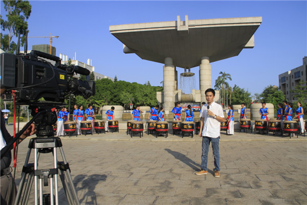 接受完央视采访的鼓手陈俊良走下场时还擦拭着脸上的汗水,看得出,第一次上央视的紧张和兴奋还没有完全消退。这次活动鼓队有些仓促,5号接到通知,集结、训练、排演,只在三天内完成了上镜的准备工作,当然,这也得益于他们平时良好的训练。陈俊良说,这几日天气炎热,队员们准备的都很辛苦,不过得知要上央视,大家都很高兴,在镜头前击鼓好像也更卖力些。不少同学打电话告诉了家里人,他自己也通知了父母,叫他们记得收看。“我的家在马来西亚吉隆坡。”说完,他便回到场内准备下一场福建电视台的直播了。