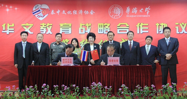 中国华侨大学与泰王国泰中文化经济协会今日上午签署了华文教育战略合作协议,以增进中泰交流,进一步加强中泰两国文化教育领域交流合作。据此,中国华侨大学与泰王国泰中文化经济协会将继续办好外国政府官员中文学习班;共同推动中泰、中国-东盟科研交流和合作;共同推动中泰、中国-东盟文化教育交流;双方建立可持续发展互动机制。