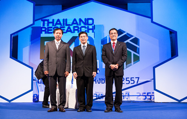 副校长张禹东(右)、泰国国家研究院秘书长Soottiporn Chittmittrapap(中)、泰中文化经济协会主席Pokin Palakul在开幕式上