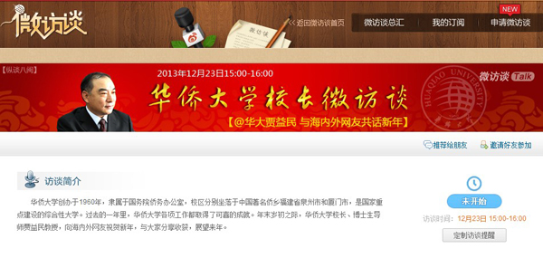 华侨大学校长贾益民今天下午应新浪微博邀请做客“微访谈”,以@华大贾益民的个人微博账号向海内外网友祝贺新年,并与网友互动交流。访谈时间15:00-16:00,网络入口:http://talk.weibo.com/ft/2013122311288。