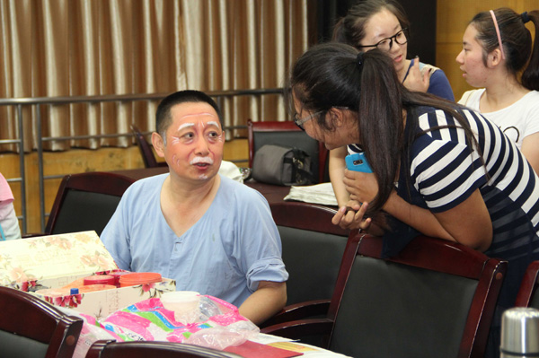 演出前一个小时,京剧舞台正在紧锣密鼓地准备着,演员们在临时化妆间摆开自己的化妆道具,开始一笔笔勾描精致的表演妆容。演员们细致的化妆技术、五颜六色的油彩,吸引了我校音乐舞蹈学院的同学。
