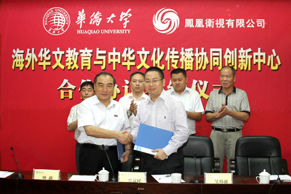 6月28日上午,华侨大学与凤凰卫视有限公司《海外华文教育与中华文化传播协同创新中心合作协议》签约仪式在陈嘉庚纪念堂二楼会议室举行。校长贾益民,凤凰卫视控股有限公司凤凰教育执行董事、总经理吴炜强代表双方在协议书上签字。凤凰教育研究院执行院长张劲平,校长助理彭霈、张云波,以及学校有关单位负责人出席签约仪式。签约仪式由校长助理曾路主持。