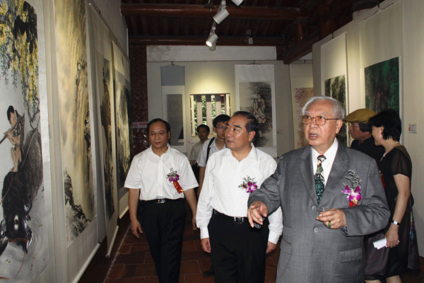 开幕剪彩后,贾益民、朱琦环还与欧豪年等走进惠风堂展厅一同欣赏了此次艺术展的优秀作品。欧豪年向贾益民、朱琦环等一一介绍了台湾艺术大学老师的作品及自己的水墨作品,并现场即兴吟诗。