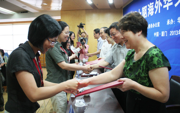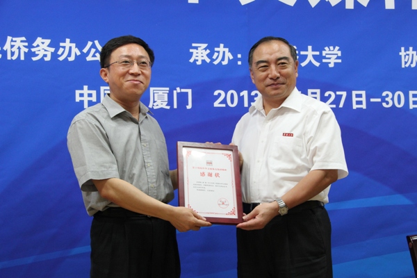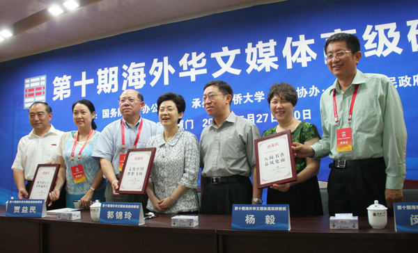 国务院侨办宣传司司长郭锦玲,国台办新闻局局长、新闻发言人杨毅,华侨大学校长贾益民,福建省海外交流协会副会长闵蕙君,华侨大学副校长张禹东,出席昨日在华侨大学厦门校区王源兴国际会议中心举行的结业式,并共同为顺利完成研修课程的学员颁发结业证书。张禹东主持结业式。