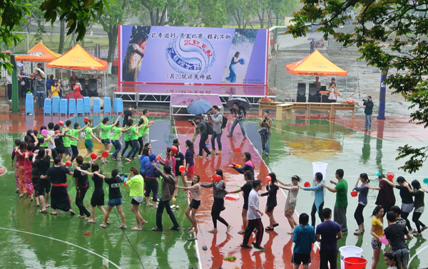 4月20日上午,在华侨大学泉州校区华丰楼前篮球场和厦门校区灯光篮球场上,来自缅甸、老挝、泰国、柬埔寨的留学生,与其他国家及港澳台地区的境外生及境内生载歌载舞,泼水祈福,一起欢度东南亚国家佛历新年泼水节这一传统节日。