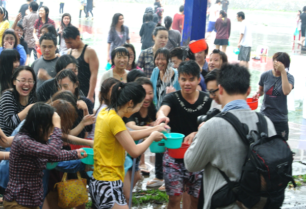 泼水场面更是热闹非凡。同学们拿着水瓢、水盆、水枪等容器盛水相互泼洒,表达祝福,并随着音乐跳起欢快的舞蹈。