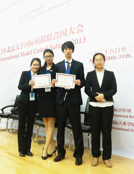 3月28日至31日,2013北京大学国际模拟联合国大会在北大举行,我校法学院学生田孝明获得大会“杰出代表奖”,工商管理学院学生苗欣和经济与金融学院学生李炜晨被大会组委会授予“杰出代表团奖”。