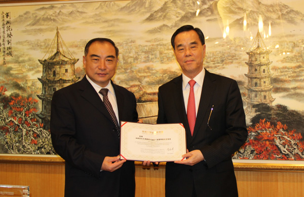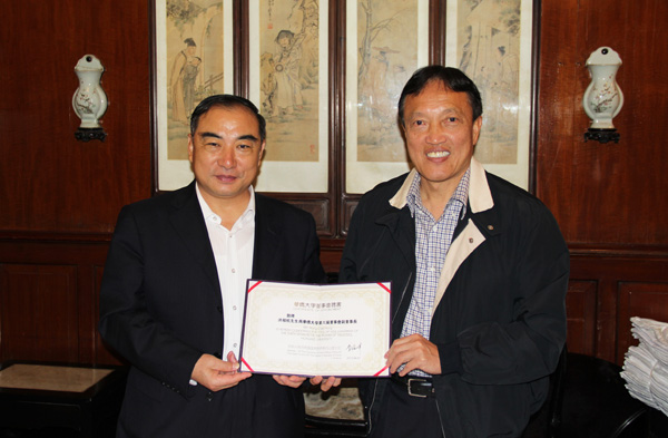贾益民向洪祖杭(右)颁发华侨大学董事会副董事长聘书