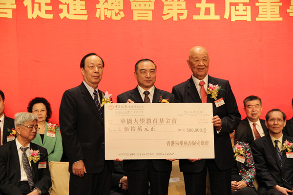 晚会上,香港泉州慈善促进总会会长、华侨大学董事会副董事长陈守仁先生,香港泉州慈善促进总会主席、华侨大学董事骆志鸿先生向华侨大学颁授五十万元港币支票,用于设立“香港泉州慈善促进总会香港学生助学金”,每年资助20名在校香港学生,连续十年。贾益民代表学校接受香港泉州慈善促进总会捐赠支票。