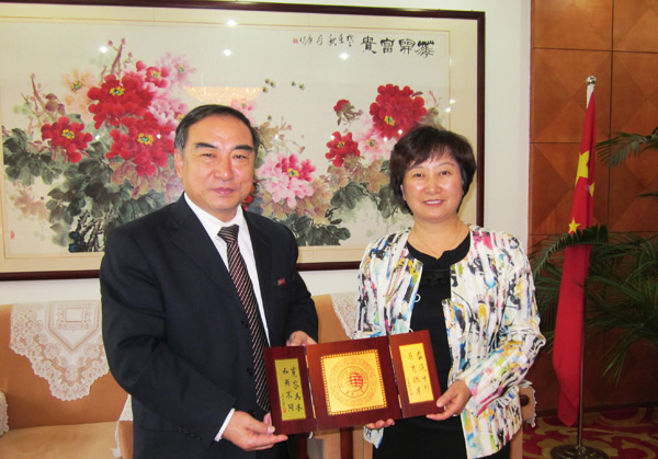 校长贾益民向云南省侨办主任杨焱平(右)赠送学校纪念品