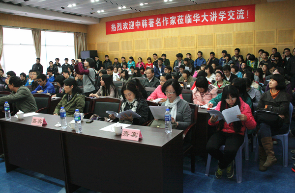在交流互动环节,洪廷善、金柱演、舒婷等分别就韩国影视的超现实特征、汉字在韩国文化中的位置、中国诗歌能否重现80年代的繁荣等问题同与会者进行探讨交流。演讲与互动持续两个多小时,师生们专心地聆听,踊跃发问,现场气氛十分热烈,让与会的中韩作家深切感到“华大师生对文学的热爱和对精神生活的崇尚与追求。”