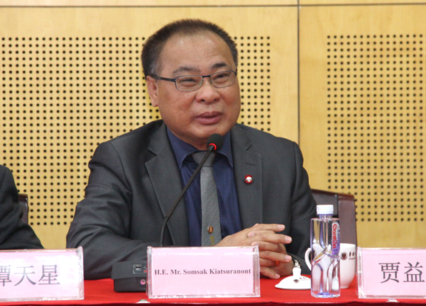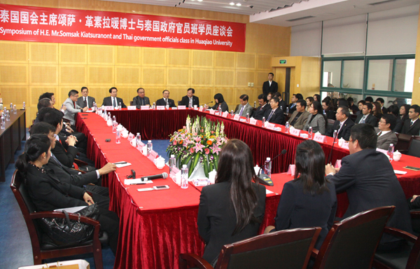 12月29日上午,泰国国会主席兼下议院议长颂萨•革素拉暖博士一行访问华侨大学,并看望正在华侨大学进修汉语的泰国政府官员中文学习班全体学员。中国国务院侨办副主任、中国海外交流协会副会长谭天星陪同访问,并出席颂萨主席与泰国政府官员中文学习班学员们的座谈会。