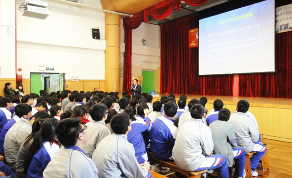 在澳门开展招生宣传工作期间,我校招生宣传小组分别走访了濠江中学、培正中学、教业中学、工联职业技术中学、东南中学、新华学校等19所中学,以播放学校宣传片、幻灯片补充介绍以及现场问答的方式,直接面向毕业班老师、同学系统地介绍我校的基本情况、办学特色、校园文化、2013年招生政策以及学校培养澳门学生方面的具体措施。同时针对澳门高中毕业班学生比较关心的环境、生活、交通等方面的情况,进行图文结合宣讲,尽可能消除学生的升学疑虑,以充分展现我校作为一所内地适合港澳学生就读的高校所特有的诸多办学条件。