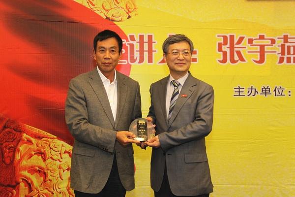 陈海基向张宇燕颁发“华大讲堂”主讲嘉宾纪念牌