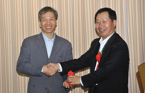 民进泉州市委会专职副主委黄金钟向华大总支部主委黄奕辉(左)授印