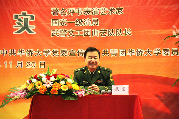 听“三十年改革开放,中国共产党走了九十年的路,我们的共和国才成立63年。这30年这90年这63年,我们如同从昨天走到今天,犹如从冬天走到春天。我们从旧走到新,我们从梦走到真……”著名评书表演艺术家、国家一级演员、武警文工团曲艺队队长秋实先生近日做客华侨大学“学习十八大精神报告会”,作“没有共产党,就没有新中国——论当代青年核心价值观”专题报告。