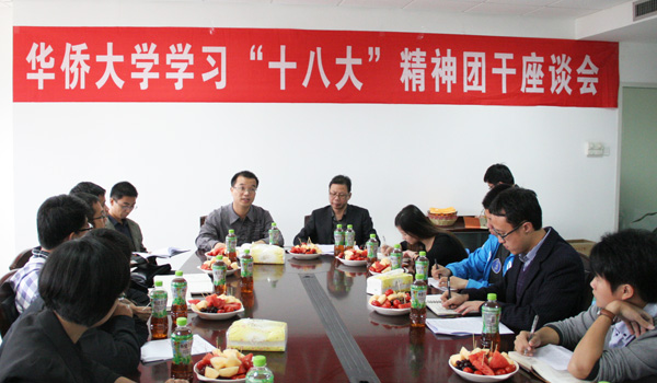 11月21日上午,华侨大学学习“十八大”精神团干座谈会在厦门校区行政研发大楼A601召开。校党委宣传部部长李辉,校团委书记李庭志、副书记叶荔辉,厦门校区各学院团委书记及学生团干代表等出席座谈会。