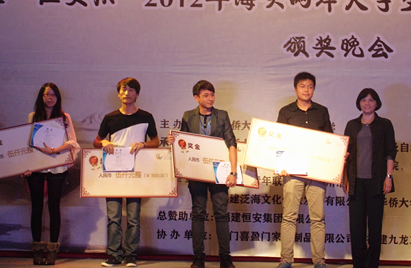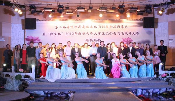 与论坛同时举行的“恒安杯”2012年海峡两岸大学生文化与创意设计大赛共决出了两名金奖、四名银奖、六名铜奖。华侨大学刘康的《儒•道 文化水龙头》、仇文超的《清水遥》摘得大赛金奖;台湾亚洲大学梁琬莉的《影餐》,华侨大学赵光、王上留的《爱上巴士——i Bus》,台湾中原大学赖佳骏、廖振闳、王中强的《开天眼》,湖北工业大学栗鹤天的《节能水槽》等获银奖;华侨大学马静文、崇书庆的《Mulan》,台湾亚洲大学李柏勋的《无限延伸尺》,台北科技大学林佳慧的《转换之间》,浙江工商大学史腾高、邹雨娟的《喷雾笔》,华侨大学邓浩林的《鼎食——电蒸机》、台湾中原大学张嘉琪的《驿云》获铜奖。