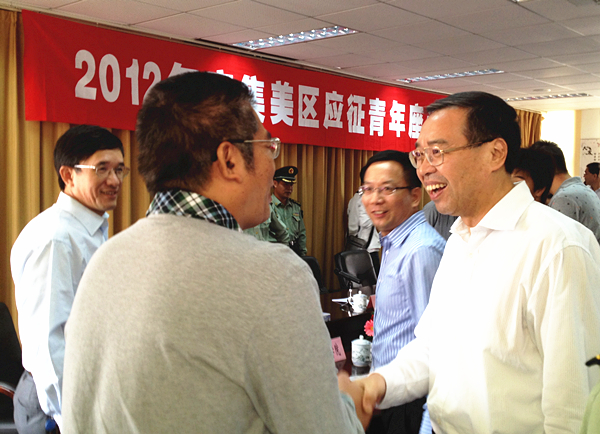 11月5日上午, 2012年度集美区应征青年座谈会在集美区第二医院会议室召开。厦门市市长刘可清、警备区司令员黄谨皑,集美区区委书记倪超、区长李辉跃等出席会议并看望正在参加体检的应征青年。我校副校长刘斌率学生处相关人员参加此次会议。