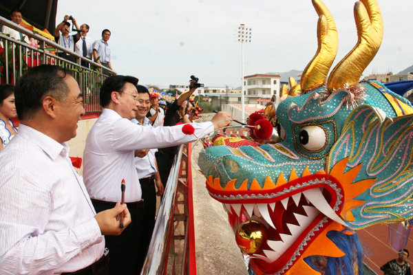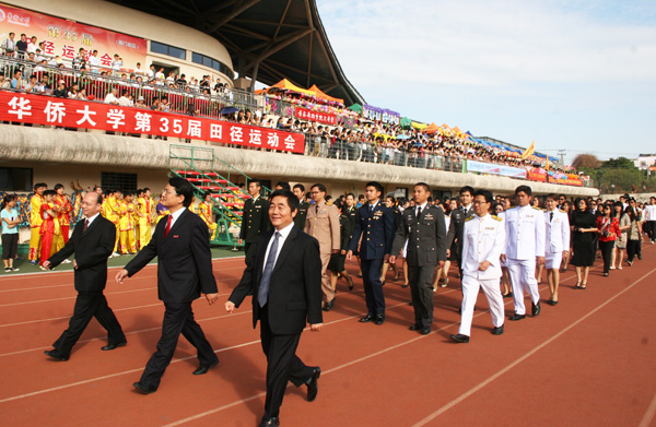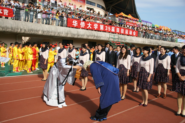 今天上午,华侨大学第35届田径运动会厦门校区赛事在庄严的国歌和激越的校歌声中拉开帷幕。莅校视察的国务院侨办副主任马儒沛出席开幕式,宣布运动会开幕,并在祥龙点睛仪式上与国务院侨办文化司副司长李民、华大校长贾益民一起为三条祥龙点睛,祝福华大“好运当头”。校长贾益民致开幕辞。