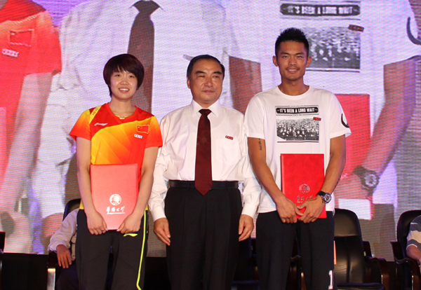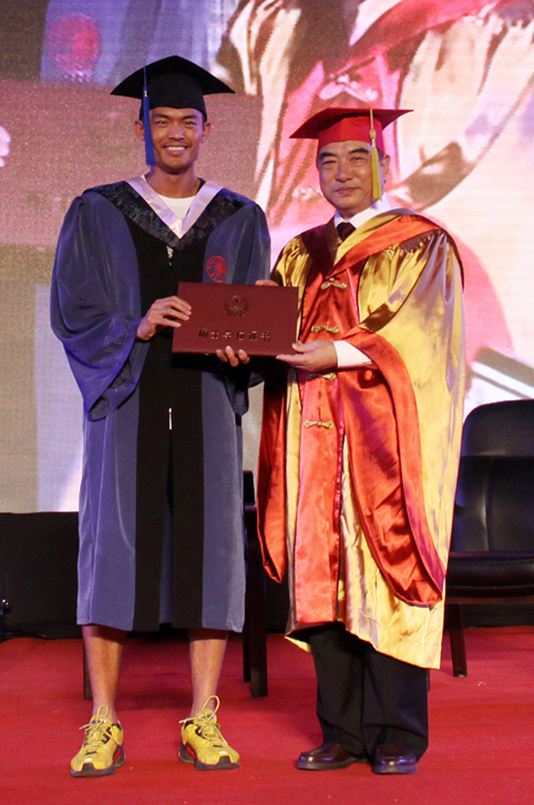贾益民为林丹颁授硕士学位证书。林丹成为国家羽毛球队唯一具有硕士学位的运动员。