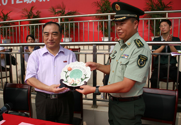 校长贾益民向中国人民解放军73141部队赠送学校纪念品