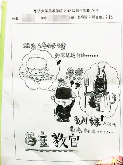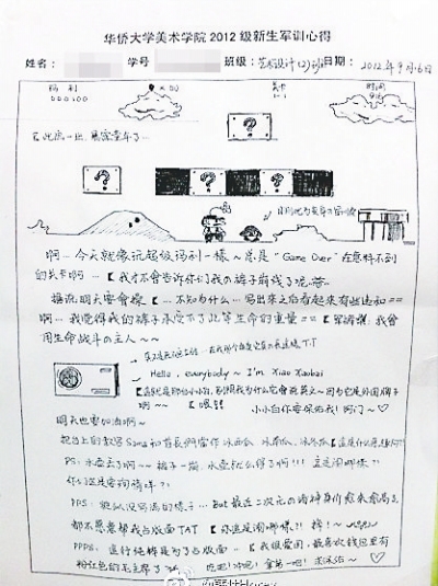 另有同学用超级玛丽游戏页面图表达军训过程的艰辛,如同玩游戏般经常game over(游戏结束),同时将统一下发的军训心得稿纸经寥寥数笔绘制成了IPAD;也有同学画出教官在训练和休息时变换成天使与魔鬼,感慨教官表情百变;更有同学赋古诗一首,配上寥寥几笔的写意画,颇有意境……