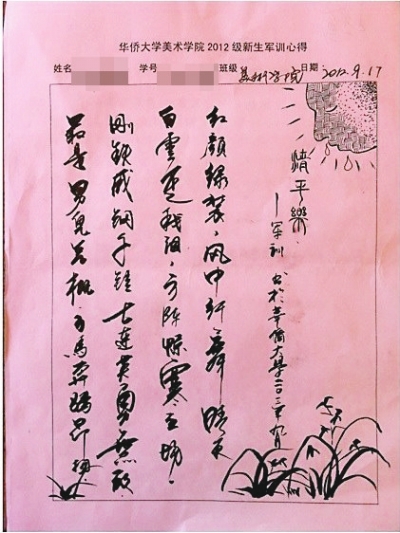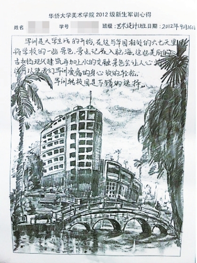 据了解,美术学院今年印发的军训心得稿纸,没有使用排线或方格稿纸,只保留了标题、姓名等基本信息,也是出于不限制新生思维的考虑,留出大片空白纸张给富有创新思维的美院新生来完成军训心得。
