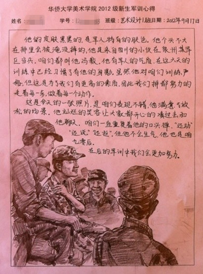 我校2012级新生军训正紧张有序地展开,除了每天正常的军事训练外,各学院均要求每一位参训学生每天上交一份军训心得。其中,美术学院新生们上交的军训心得图文并茂,富有新意,结合了自己的美术特长,让人眼前一亮。经百度贴吧、新浪微博等传播后,广受网友关注。