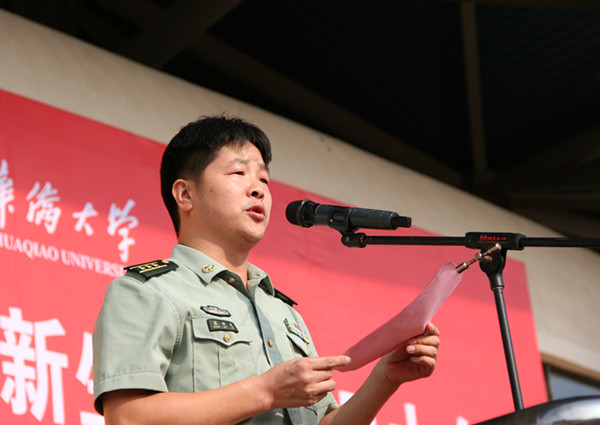 承训教官代表刘情伟,新生代表、计算机学院学生木一凡先后发言。刘情伟表示,将以高度负责的精神,严格致训,科学组训,合理施训;以最良好的形象、最昂扬的精神、最过硬的技能,投入此次军训,圆满完成承训工作。木一凡表示,将以军人的标准严格要求自己,严守纪律,服从教官;不畏艰险,刻苦训练;团结友爱,创优争先,高质量地完成军训任务。