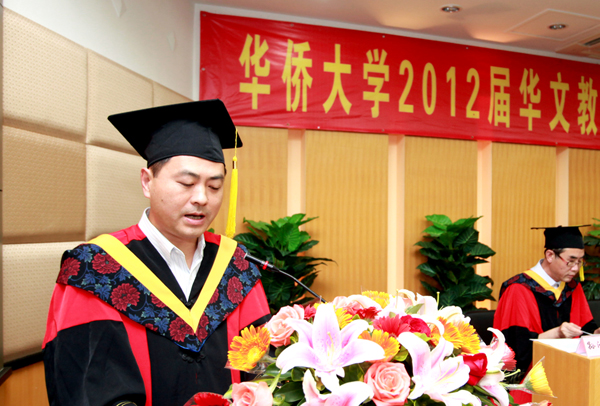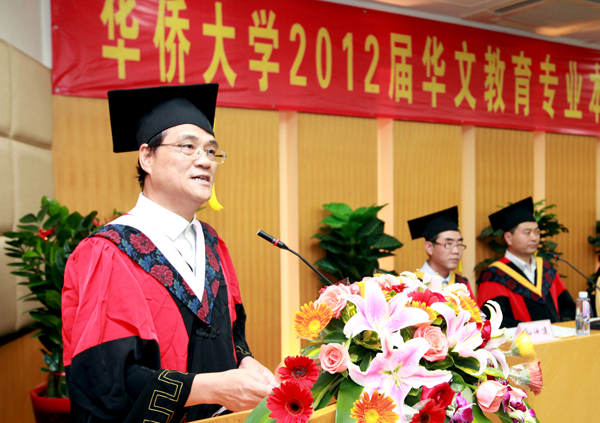 华侨大学副校长张禹东代表校方致辞。他指出,华文教育正处于大发展的最好历史性机遇时期,华文教育既是华人族群文化传承、族群特性保留的重要载体,也是文化传播的重要形式。他对即将走上华文教育岗位的毕业生们提出两点希望:第一,要树立从事这项工作的神圣责任感和使命感。树立长期从事华文教育的志向,树立坚定的信念,淡泊名利。第二,要常怀感恩之心。感恩社会,感恩家庭,感恩朋友,感恩一切帮助过自己的人。