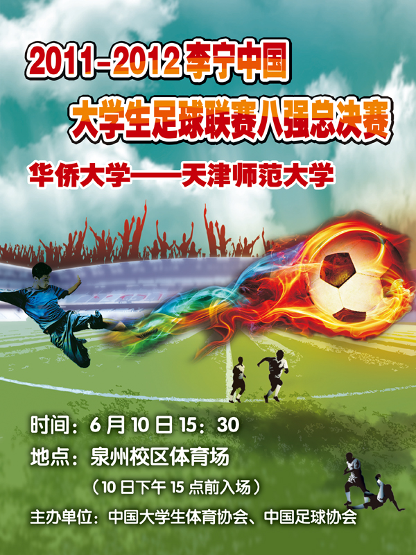 2011-2012年李宁中国大学生足球联赛八强总决赛6月9日开赛。6月10日15:30,华侨大学足球队将坐镇泉州校区主场,迎战天津师范大学。