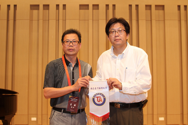 台湾艺术大学校长谢颙丞向华侨大学艺术团团长李辉赠送锦旗